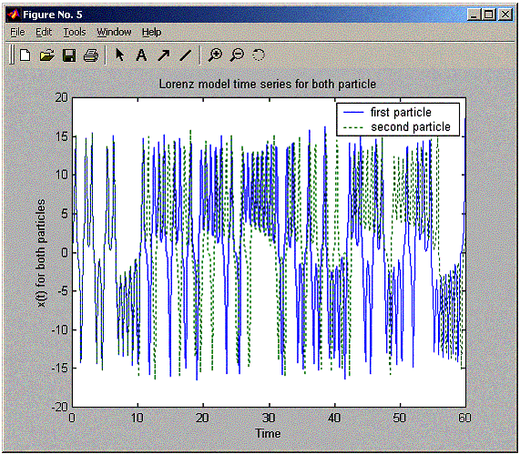 xlabel('Time'); ylabel('x(t) for both particles')
