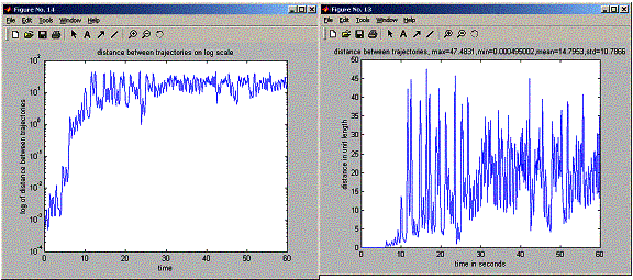 Running this program showed that given a small initial difference in state, at one point in the future, the two trajectories will suddenly diverge from each others over small amount of time, but then the trajectories settle down to distance between them that do not grow much bigger any more as happened the first time, and continue to change by small amount over time. (seen clearly on the log plot below).