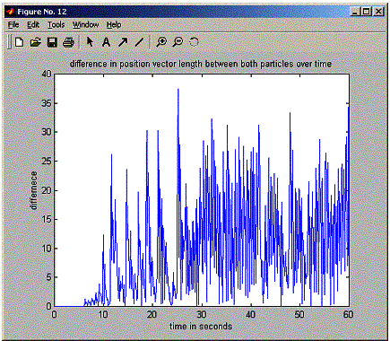 in position vector length between both particles over time');