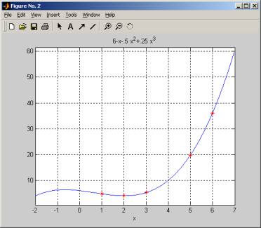 >> plot(1,4.75,'*r'); plot(2,4,'*r'); plot(3,5.25,'*r'); plot(5,19.75,'*r'); plot(6,36,'*r');