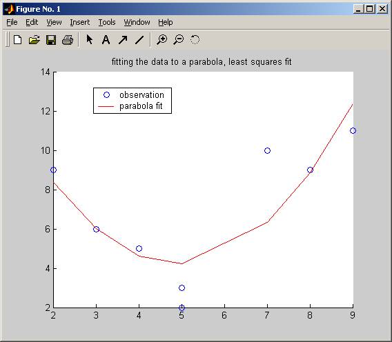 So, using a parabola, the error (in least squares sense) is 22.2422, compared to 62.26268 when fitting a stright line.