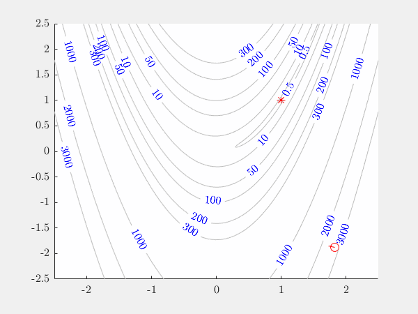 The objective function is \(f(u) = 100*(u_2-u_1^2)^2 + (1-u_1)^2\)