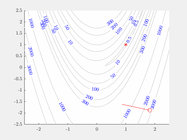 steepest descent, optimal step size, Very slow convergence near \(u^\ast \) but converged in 2079 steps. (Animation stops at step 300 to reduce size). |