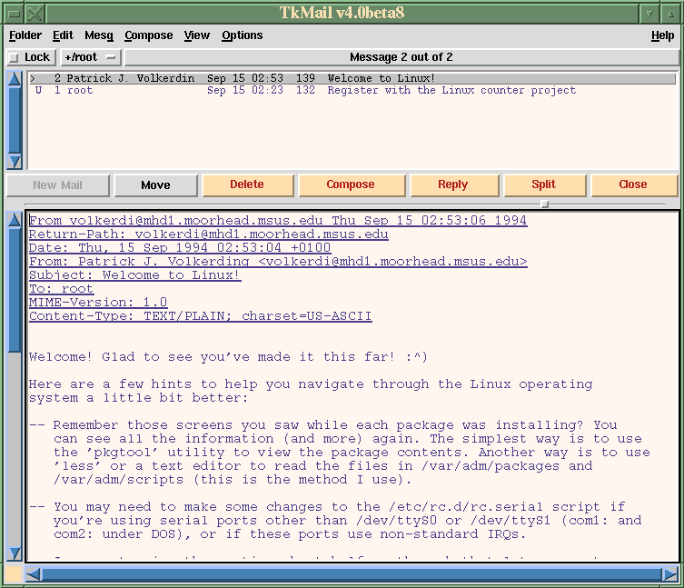Paul Raines has been working on a Tcl/Tk mail client for some time now. I'll let him describe its origin: