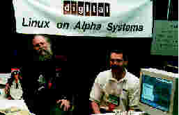 Tux, Jon "maddog" Hall, and Tom Chmielewski at Dec's booth.