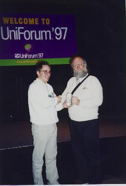 Linus receiving the UniForum Acheivment Award from Douglas Michaels