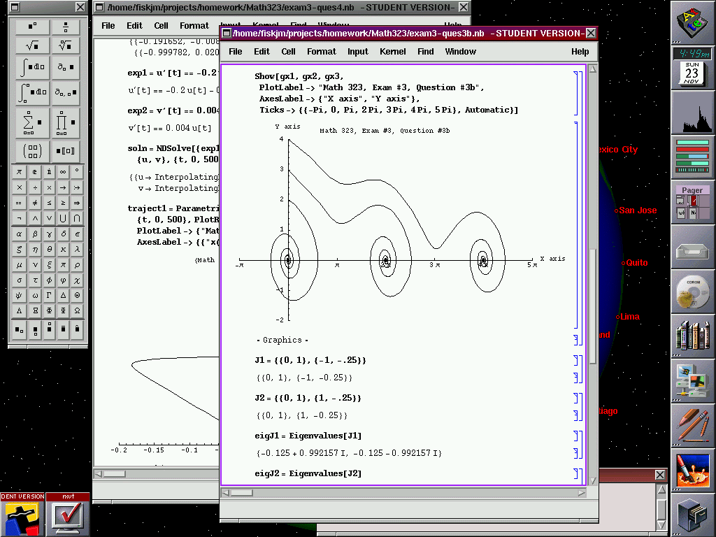 For my DiffEq class I finally broke down and purchased the venerable Mathematica 3.0 for Linux from the good folks at Wolfram Research. This has been a godsend and a wonderful toy to tinker with! I'll refrain from getting on the soap box about this one, but will say that it is a fantastic program and would HIGHLY encourage anyone in a mathematics-oriented discipline to invest in it. For the curious, here's a "hot off the press" screen-shot of what I've been up to this weekend: plowing through a DE take-home exam (and don't worry, our instructor, who's a delightful and brilliant guy, gave us the OK to use "whatever technology you have at your disposal..." :-)