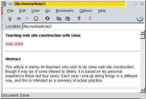So this is where Linux steps in. The Apache server works in exactly the same fashion on your local 486 Linux box and on your ISP's Sun/Solaris. So you have a fair certainty that if it works for you, it will also work on the Web. This point is particularly important when teaching kids: if what they do doesn't work because they messed up, that's OK. If it doesn't work because of a "technical problem", uh-oh. :-(