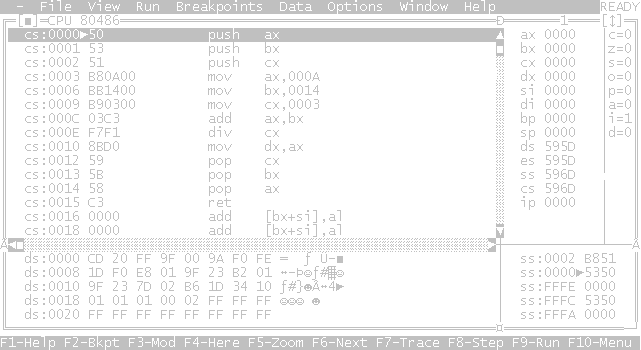 cs:0000 50 push ax cs:0001 53 push bx cs:0002 51 push cxSome useful keys for Turbo Debugger: