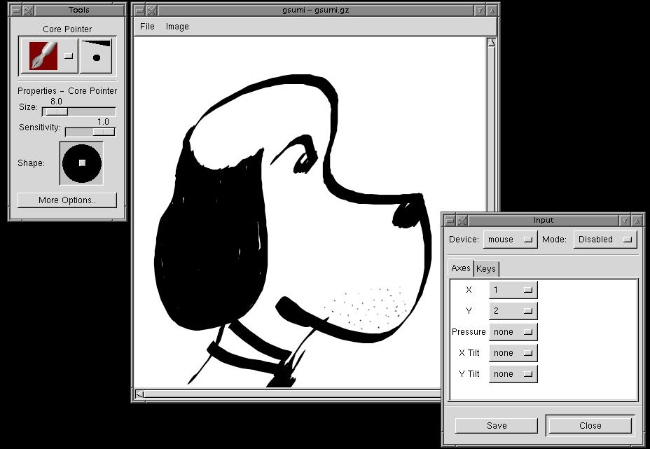 Next we want to try an application with X Input support.  The easiest one to try is gsumi, a simple black and white drawing program from Owen Taylor.  In order to use gsumi you need to first have a version of the GTK+ libraries installed that include X Input support.  If you don't have these, you can grab the source code, build and install them.  This is fairly easy to do so don't let it frighten you.  The INSTALL document that come with the source code does a decent job of describing the build process, including the one additional option argument to the configure script that you need:  --with-xinput.  So, taking the INSTALL information from GTK+ and modifying it, you would do the following: