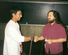 At this point Stallman took an extended break to sell GNU manuals, give away stickers, and talk one-on-one with audience members. Of the audience of about 200 people, dozens purchased Emacs and Make manuals which rms patiently signed with his customary "Happy Hacking." (He was noticeably quick to point out the "cheapskates" who asked for signatures on the free FSF brochures that were also being distributed.) This was followed by a final Q & A for the thirty or forty hardcore hackers who had stuck around.