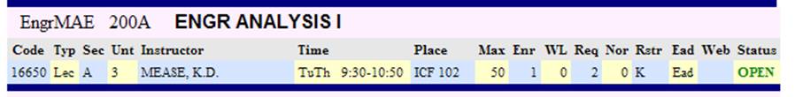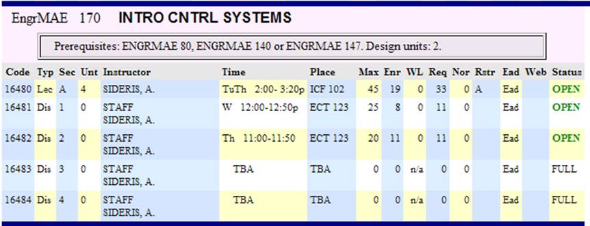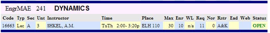 MAE241 2-3:20 dynamics (AUDIT) ELH 110 |