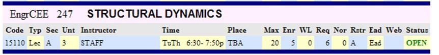 6:30-7:50 structural dynamics. CEE 247 TBA (AUDIT) |
