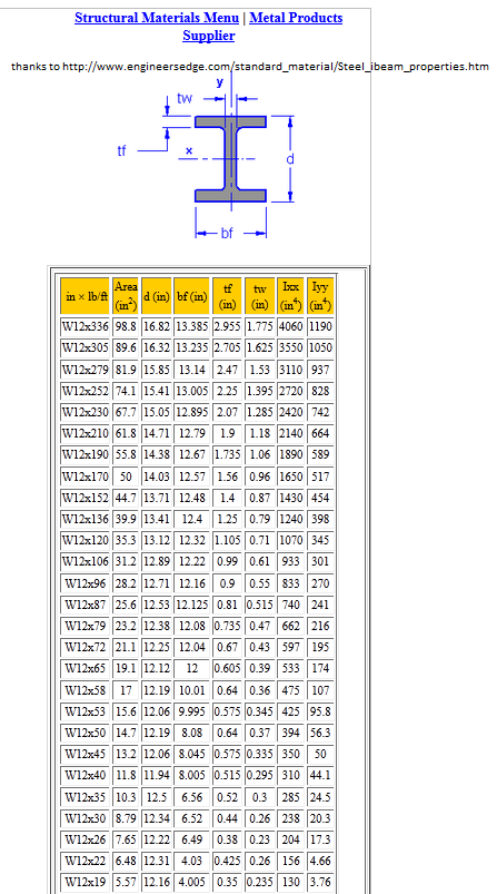 Instructor web site http://mfeng.calit2.uci.edu/ References 1. Steel_ibeam_properties.htm gives I for different W sections for steel. In case the above page goes away, here is a screen shot copy right is due to engineeringsedge.com A copy is saved here 2. http://www.hancockjoist.com/glossary.htm structural glossary 3. http://www.mcvicker.com/offtech/smwmsp.htm engineering terms. |