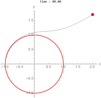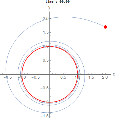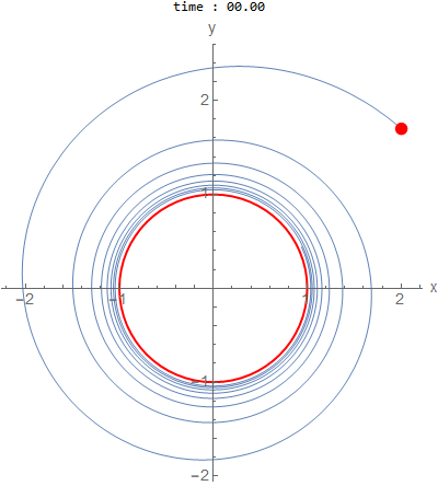 When \(a\) and \(b\) is not \(1\), then the solution shows more iterations until it reaches the limit cycle, which is a circle of radius \(1\).