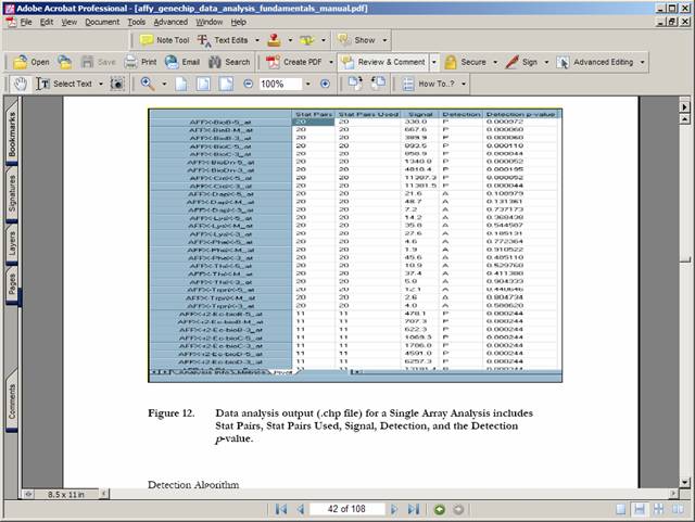 The .CHP file contains Signal values and Presence Calls for each probe set on the microarray and can be viewed using MAS 5.0. The Statistical Algorithm is used to calculate the Signal values and Presence Calls from the probe-level fluorescence intensities contained in the .CEL file.