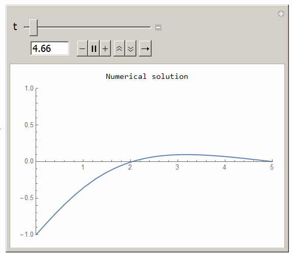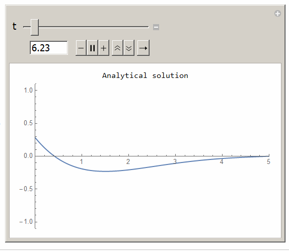 ClearAll[t, x, n] k = 1; L0 = 5; max = 400; u[x_, t_] = Sum[(((2*L0^2*(k*n^2*Pi^2))/(n*Pi*(L0^4 + k^2*n^4*Pi^4)))* Exp[(-k)*((n^2*Pi^2)/L0^2)*t] - (2*L0^2*(k*n^2*Pi^2*Cos[t] + L0^2*Sin[t]))/(n* Pi*(L0^4 + k^2*Pi^4*n^4)))*Sin[((n*Pi)/L0)*x], {n, 1, max}] + ((L0 - x)/L0)*Sin[t]; Manipulate[Grid[{{"Analytical solution"}, {Plot[Evaluate[u[x,t]],{x,0,5},PlotRange->{{0,5},{-1.1,1.1}}, ImageSize->400]}}], {{t,0,"t"},0,100,.01} ]