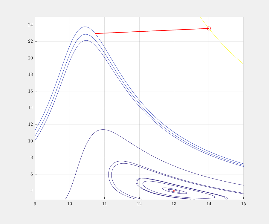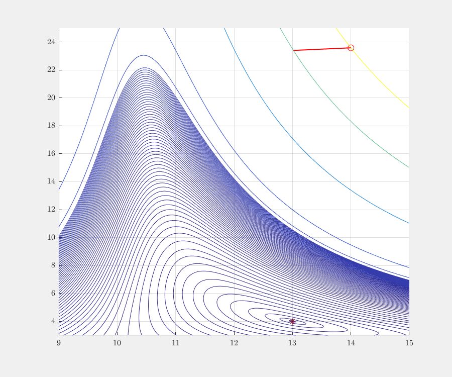 The objective function is \(f(u) = (11-u_1-u_2)^2 + (1+u_1+10 u_2-u_1 u_2)^2\) Starting from \(u^0=\{14;23.59\}\).