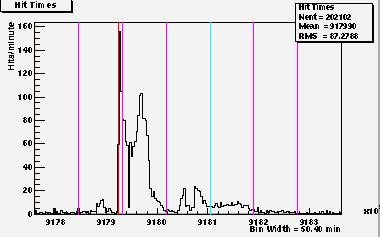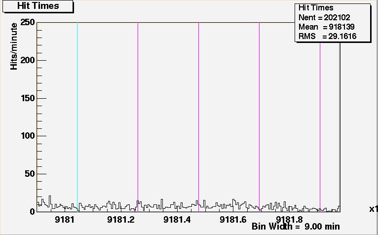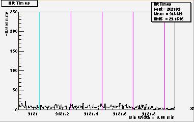 What follows is a table of plots of the same data but on a finer time scale. (9 min/bin as opposed to 50 min/bin in the plot in Figure 1.) The purpose is for one to better study the data. The purple lines are now time marker on 6 hour intervals. The limits on the time axis overlap between plots to help the reader follow the continuity of the data. Because of binning effects, the overlap regions of the data from one plot to the next look slightly different, and this dissimilarity should be ignored.