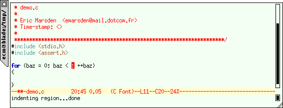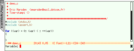and the result should look like this. The next example demonstrates how to insert a timestamp of the form -ecm1999-02-29 in the current buffer (pet peeve: given the value of a uniform, standardized external representation for dates, I make a point of systematically using the ISO 8601 format). You invoke this macro by typing C-c d dstamp. The corresponding code (which also demonstrates the use of an alias to factorize out commonly used definitions) is: