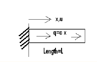 A cantilever beam is loaded with traction load of q = c x (for some constant c). It is fixed on the left side. We need to find axial deformation u (x)