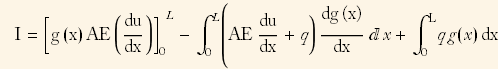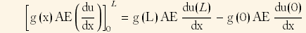 and now since a test function must also satisfy the essential conditions, hence g(0)=0 and also the trial function satisfies the natural boundary conditions at x=L which is that there is no load at that point, hence this means A E (du/dx) = 0 since this is the load at the end. Hence the integral becomes