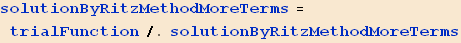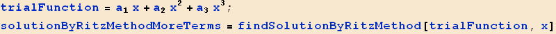 We see from the above that as more terms added to the trial function, after the cubic polynomial, the solution no longer changes. This implies, at least in this example, that the exact solution was reached. (Need to find a formal proof of this).